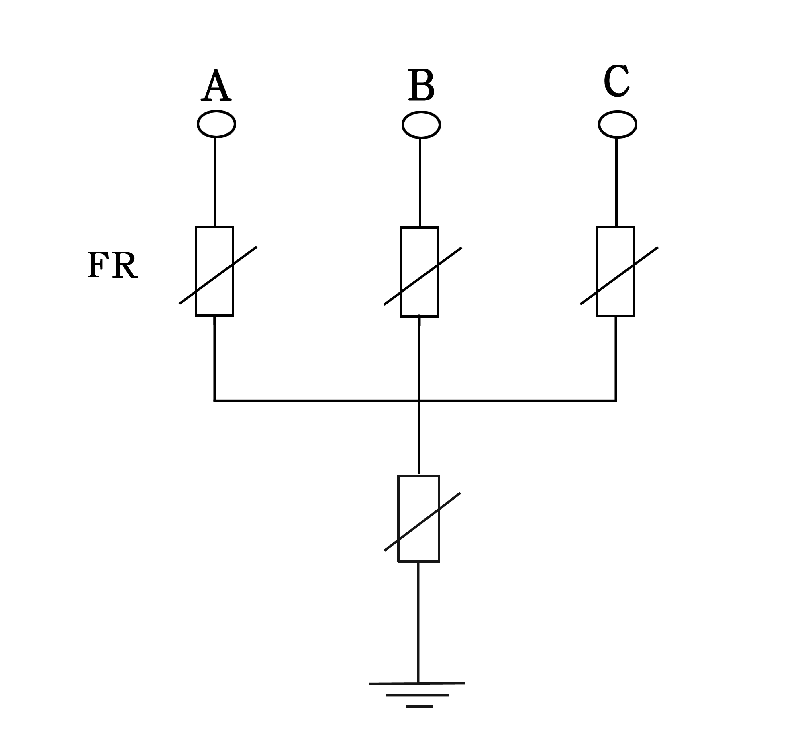本產品結構采用四星形接法,過電壓保護器A、B、C、D分別采高壓電纜引線,大大縮小了相間距離。由于采用對稱結構,其中任意三個可分別接A、B、C三相,另一相接地。