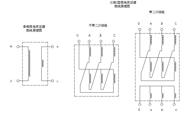 Z型接地變壓器,在結構上與普通三相芯式電力變壓器相同,只是每相鐵芯上的繞組分為上、下相等匝數的兩部分,接成曲折形連接。接線方式不同,又分為ZN,yn1和ZN,yn11兩種形式。